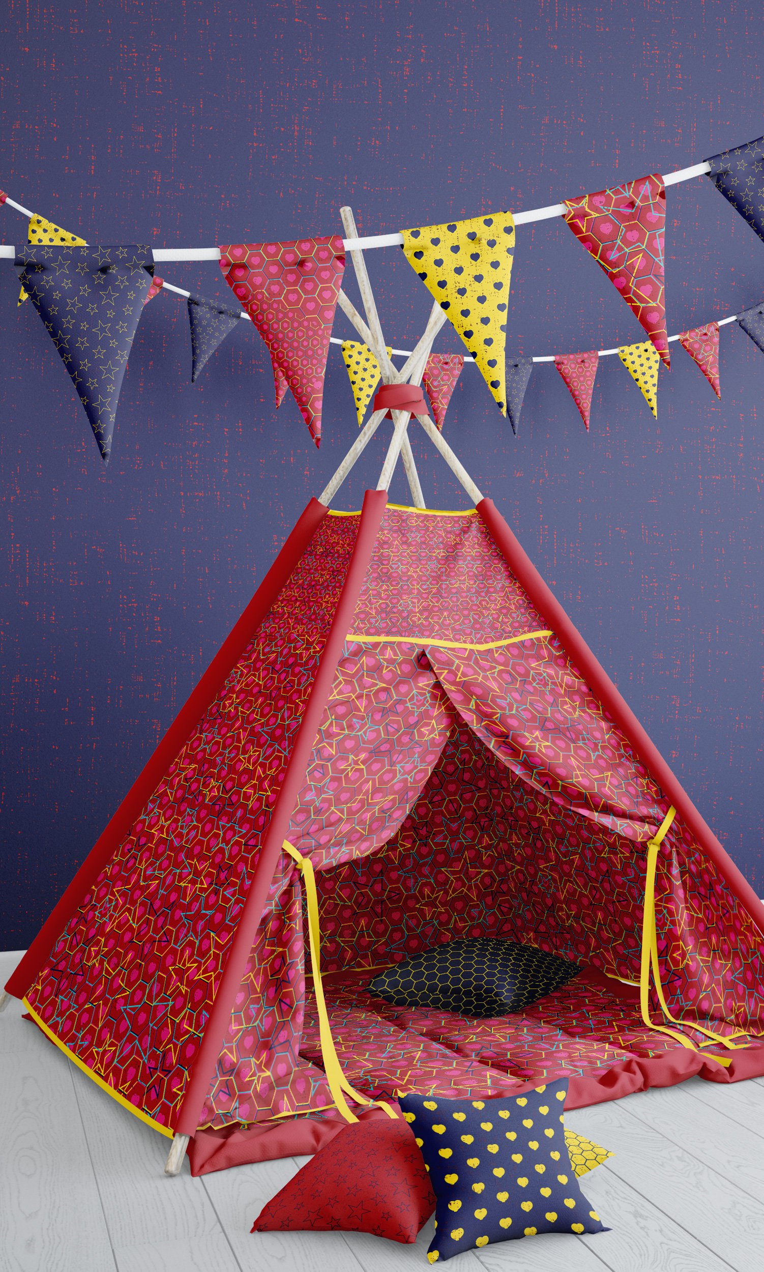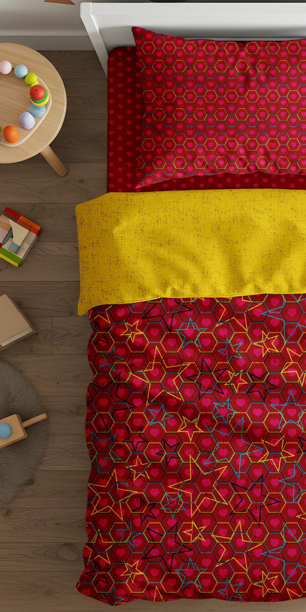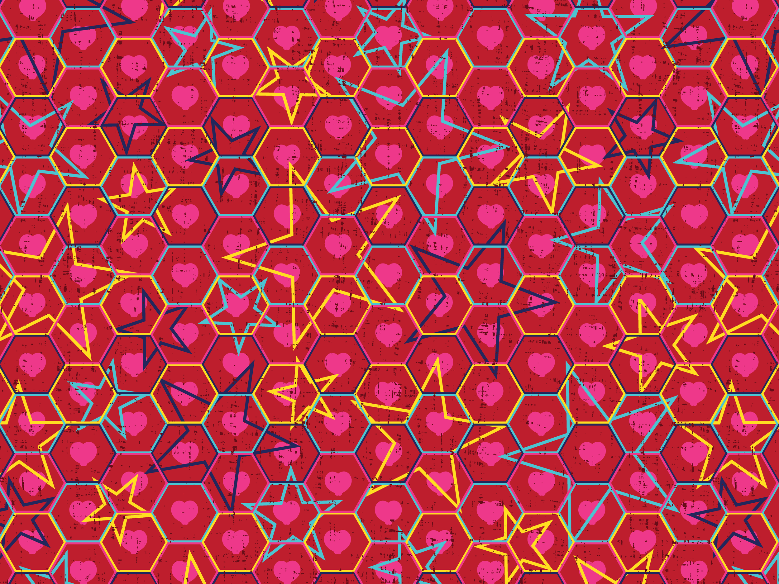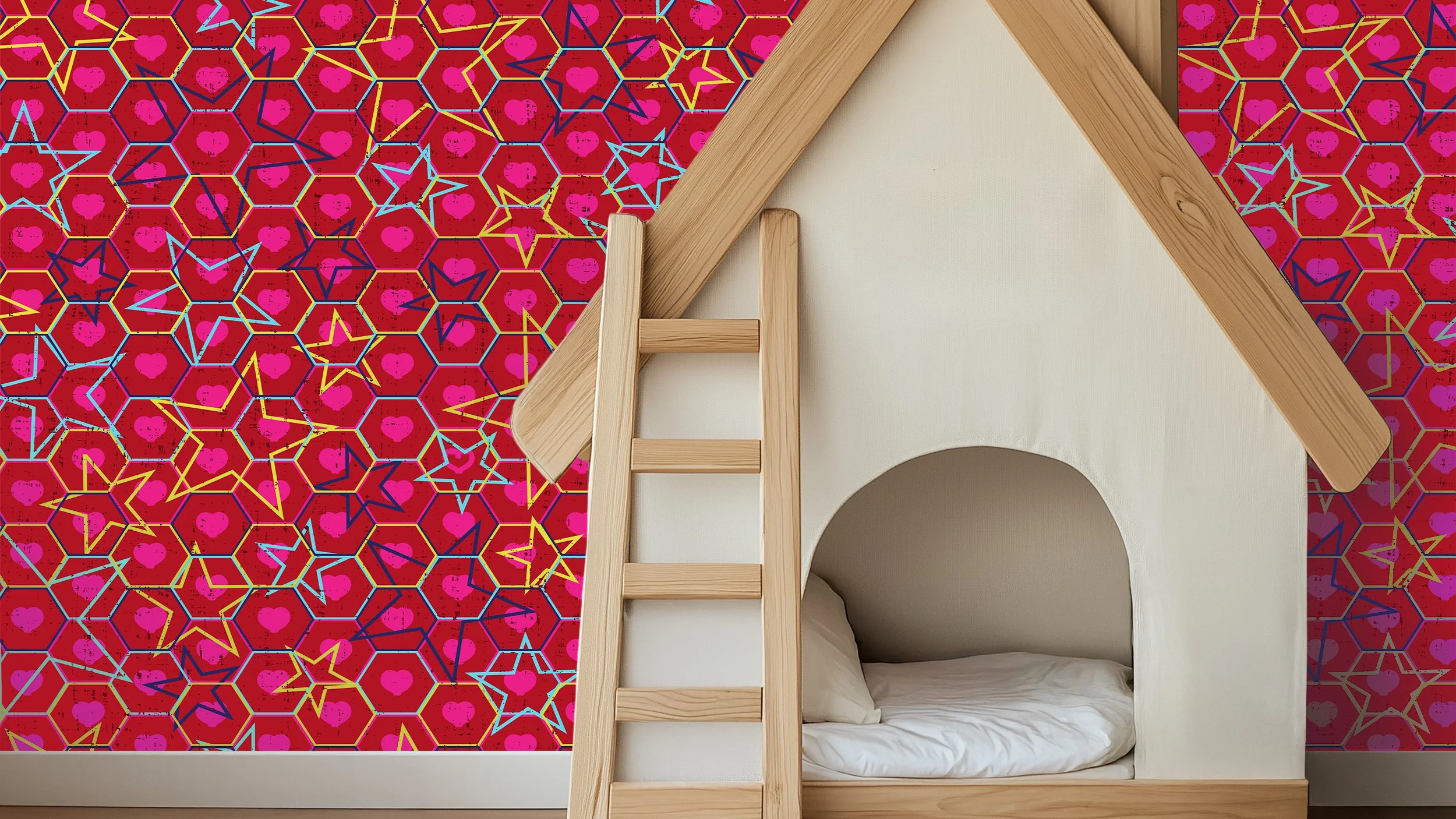 Raspberry Tapestry’s 1970s Retro Starshine Collection captures the nostalgic joy of midcentury childhood prints in geometric stars, honeycombs, and hearts.